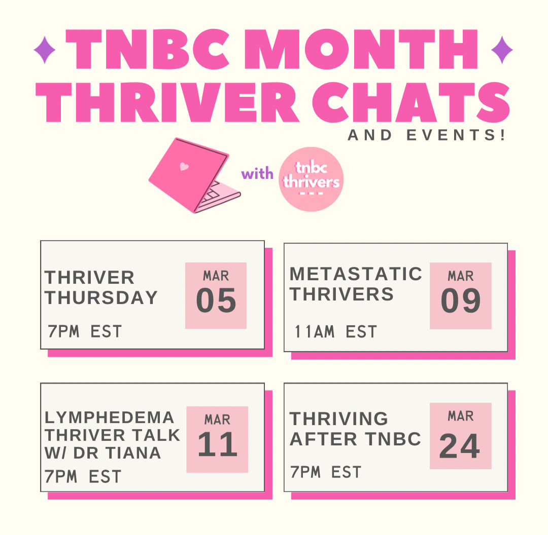 Welcome to the TNBC Thrivers CommunityWeβre on a mission to make triple negative breast cancer feel a little less lonelyJoin us for our support chats & virtual events! view our upcoming chats and events TNBC month is coming in hot! Virtual Events Happening Soon: Events Feb 24 Feb 24, 2026 7:00β―PM – 8:30β―PM19:00 – 20:307:00β―PM – 8:30β―PM Thriving After TNBC Feb 24, 2026 7:00β―PM – 8:30β―PM19:00 – 20:307:00β―PM – 8:30β―PM Feb 24, 2026 7:00β―PM – 8:30β―PM19:00 – 20:307:00β―PM – 8:30β―PM Mar 5 Mar 5, 2026 7:00β―PM – 8:30β―PM19:00 – 20:307:00β―PM – 8:30β―PM Thriver Thursday Mar 5, 2026 7:00β―PM – 8:30β―PM19:00 – 20:307:00β―PM – 8:30β―PM Mar 5, 2026 7:00β―PM – 8:30β―PM19:00 – 20:307:00β―PM – 8:30β―PM Mar 9 Mar 9, 2026 7:00β―PM – 8:30β―PM19:00 – 20:307:00β―PM – 8:30β―PM Metastatic Thrivers Mar 9, 2026 7:00β―PM – 8:30β―PM19:00 – 20:307:00β―PM – 8:30β―PM Mar 9, 2026 7:00β―PM – 8:30β―PM19:00 – 20:307:00β―PM – 8:30β―PM VIEW ALL upcoming virtual events Get on our grid! π